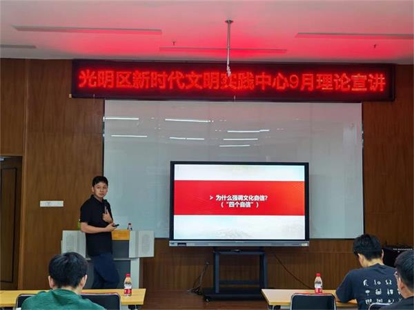 9月17日下午,黄继朝副教授在光明区新时代文明实践中心,以《新时代坚定文化自信》为题,与大家分享了新时代坚守文化自信的意义、方向及其路径。黄继朝不仅分析了文化作为一个国家、民族灵魂的重要作用、中国文化的独特性以及中华文明的突出特性。也探讨了文化繁荣兴盛对于实现中华民族伟大复兴和满足人民日益增长的精神文化需要的关键意义。