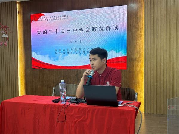 陈翔宇助理教授在公平镇新时代文明实践所解读了党的二十届三中全会政策。陈翔宇深刻分析了进一步全面深化改革必须贯彻好的六条重大原则及其相互内在逻辑关系。同时着重讲解了经济和民生领域的相关改革工作,如构建高水平社会主义市场经济体制的方式、如何推动高质量发展、如何健全宏观经济治理体系等关键问题。讲座为干部群众进一步深刻理解党的二十届三中全会精神、迎接党的二十届四中全会提供了思想支撑。