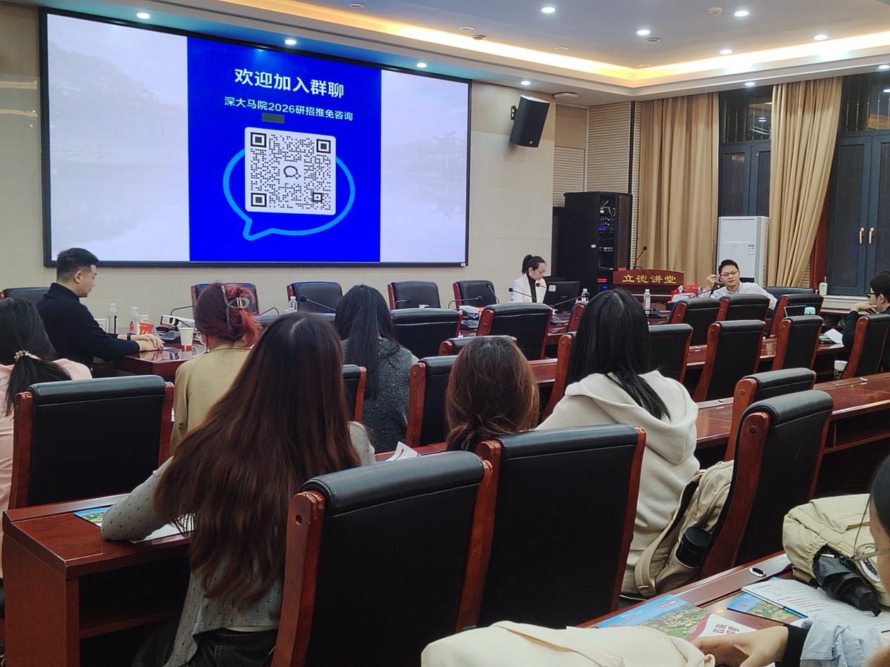 学科特色与行业发展前景,深入剖析专业优势、课程体系及就业方向,为学生提供匹配建议;奖助学金解读中,系统介绍国家奖学金、学业奖学金、校级专项补助等多层次资助项目,明确申请条件与激励机制,让学生直观感受到学校对研究生学业的支持力度;校园生活分享则聚焦双维度,展示图书馆、实验室等优质教学设施,介绍学术社团、文化节等丰富活动,让学生对深大研究生生活的期待值显著提升,整场互动环节氛围热烈。